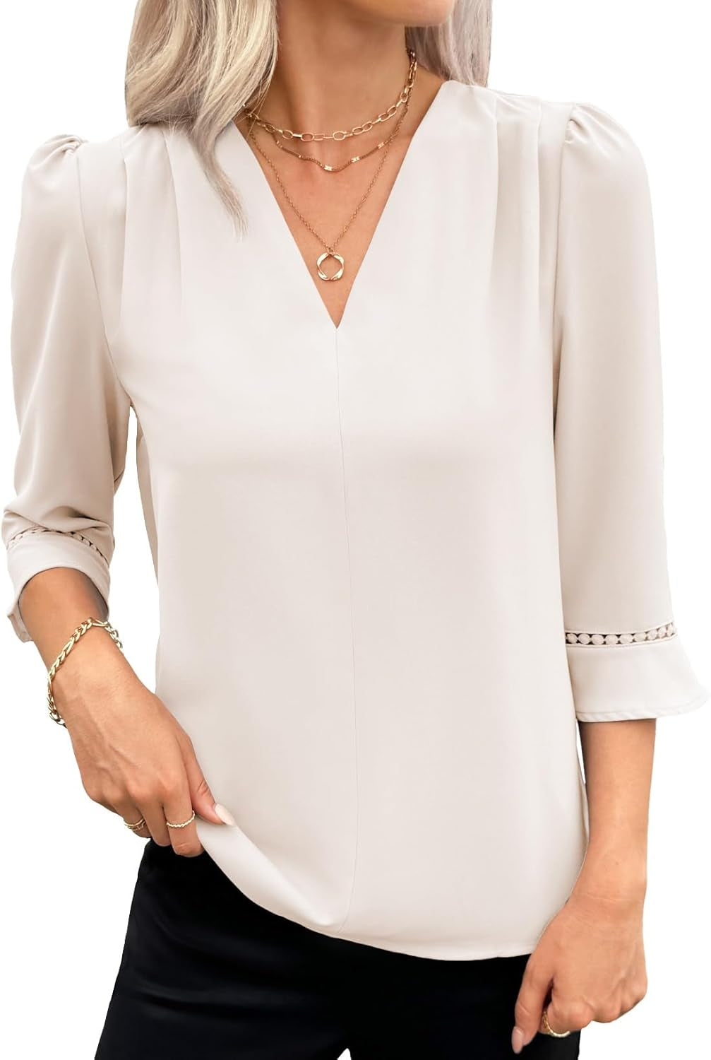 Women'S 3/4 Sleeve Tops Dressy Casual Pleated V Neck Business Work Blouses Office Shirts