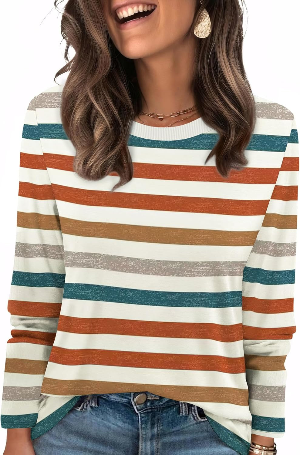 Womens Striped Long Sleeve Shirts Fall Outfits 2025 Color Block Tops Fashion Clothing Ribbed Crewneck Tee Blouses