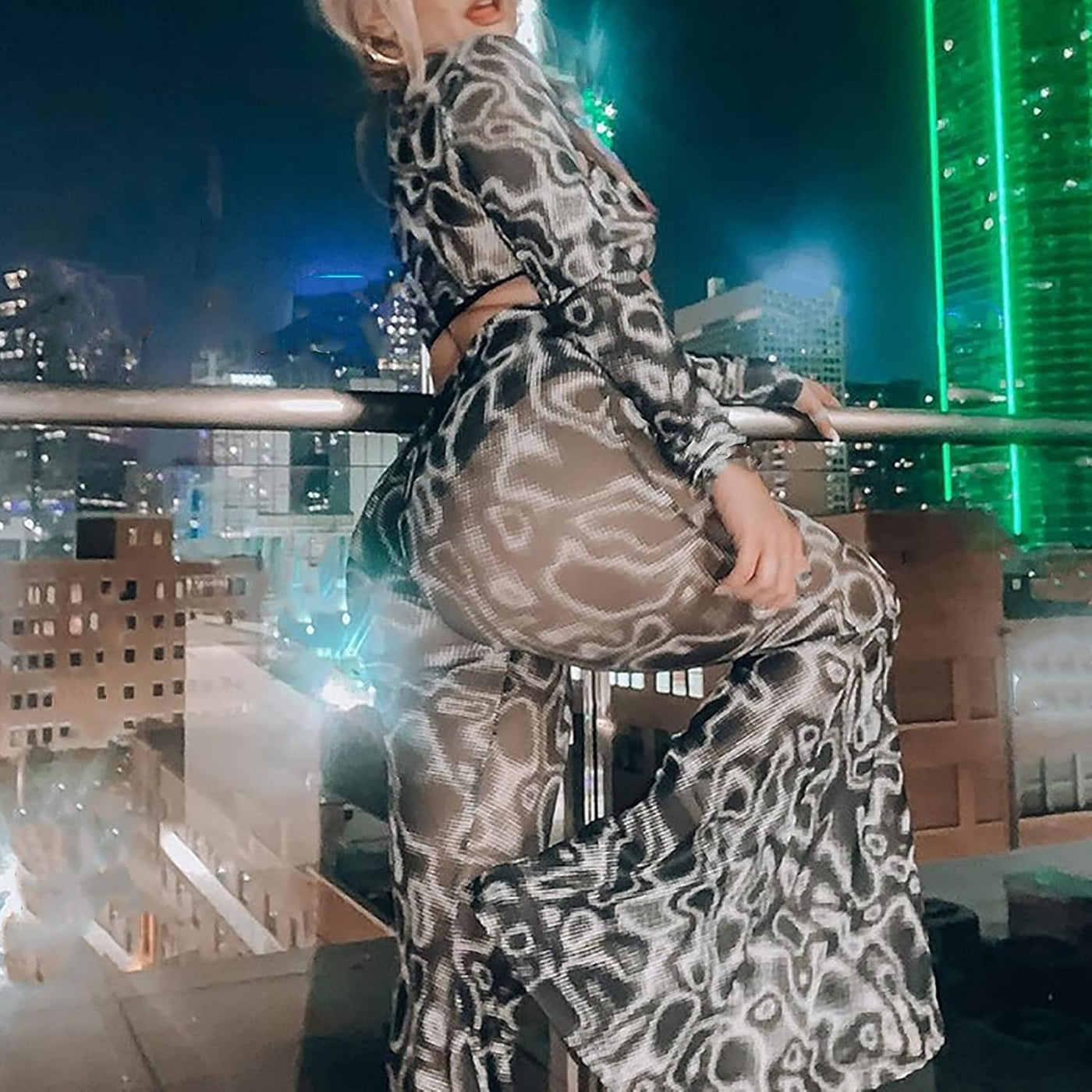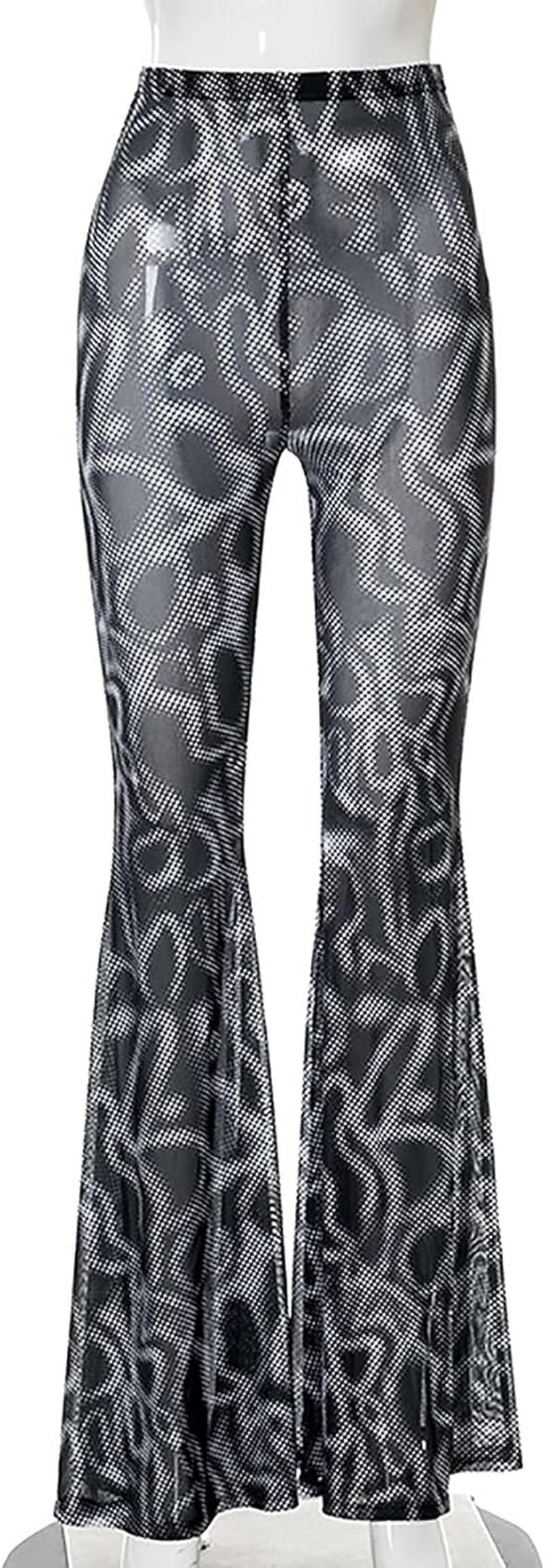 Women’S High Waist Rave Mesh Sheer Pants Flared Bell Bottom Pants for Rave Festival Dance Clubwear - Tie Dye Grey / Small
