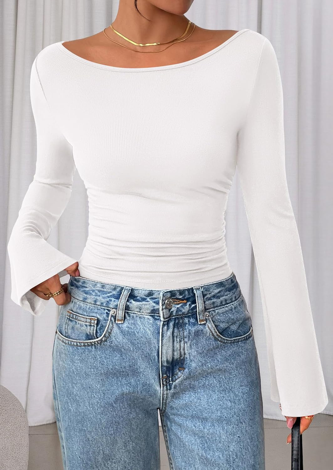 Womens Long Sleeve Shirts 2026 Spring Crop Going Out Tops Casual Boat Neck Bell Sleeve Ribbed Ruched Y2K Clothes - White / Medium