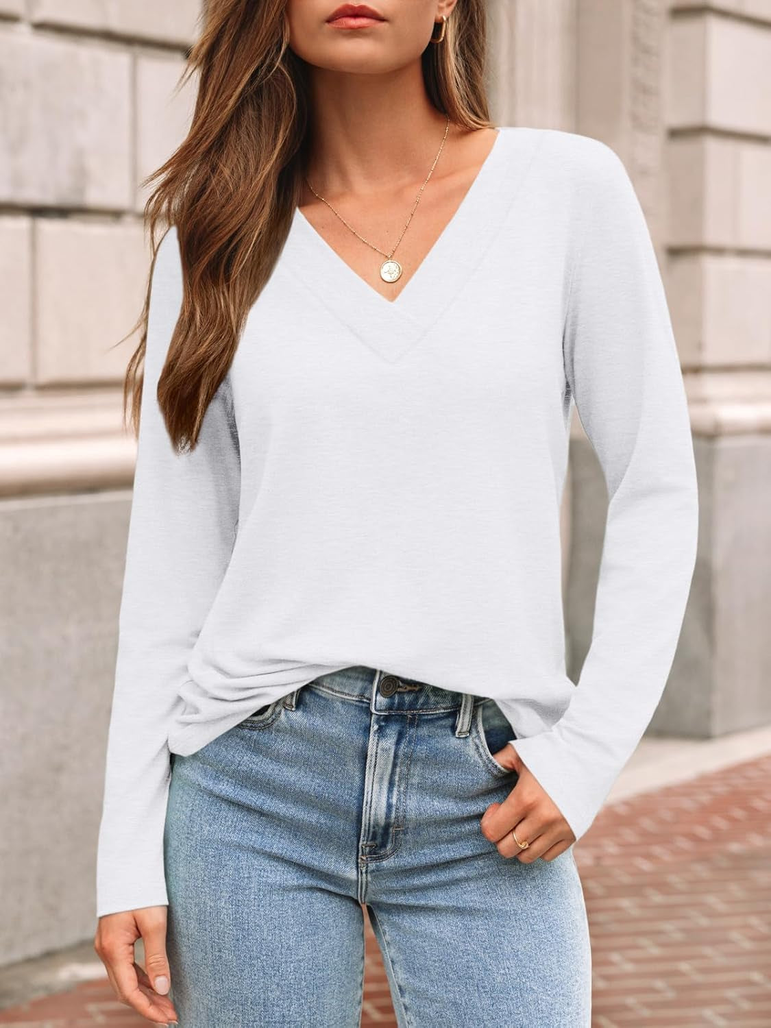 Long Sleeve Shirts for Women Tops V Neck Casual Top Comfortable Shirt Soft Basic Tees Women Blouses - White / Large